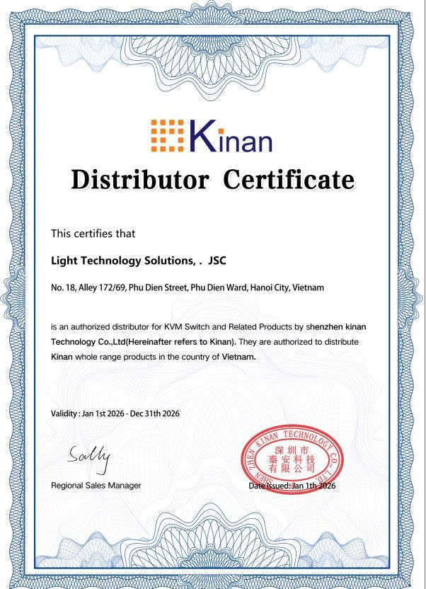 Trong năm 2026, LightJSC tiếp tục vinh dự nhận chứng chỉ nhà phân phối chính thức các sản phẩm Kinan – thương hiệu nổi bật trong cung cấp giải pháp quản lý cho Datacenter và giám sát dành cho trung tâm điều hành và doanh nghiệp hiện đại.